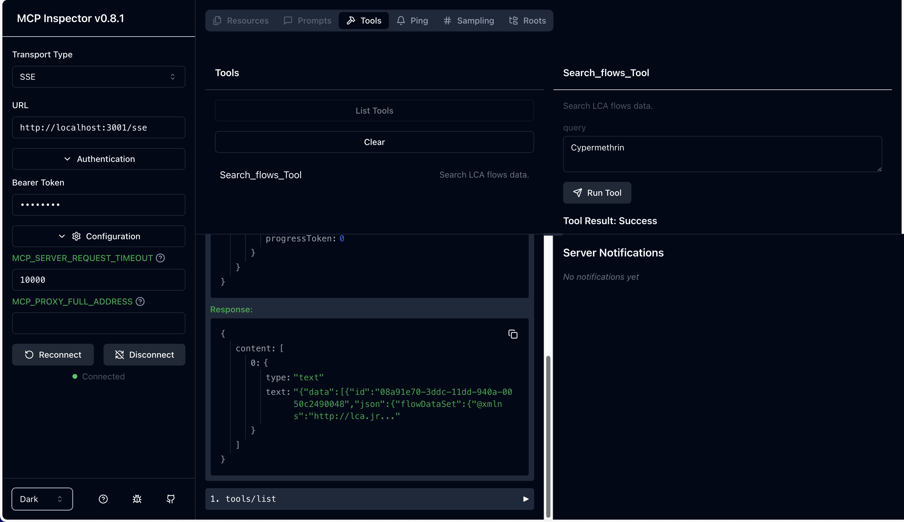 📷 图示:我们使用 MCP Inspector 工具调试查询“Cypermethrin”相关流信息,验证 MCP 服务已成功返回结构化数据。